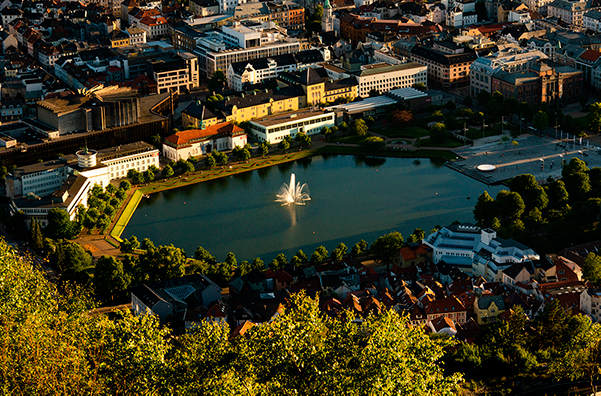 Трамвай приезжает прямо в центр Бергена, конечная находится возле Бипаркена, на берегу живописного восьмиугольного пруда Лилле-Лунгегордсван. По случаю отличной погоды (а в Бергене это, по статистике, случается чуть реже, чем раз в пять дней), значительная часть взрослого населения города лежала на газонах, мочила пяточки в фонтанах и всячески наслаждалась внезапно нагрянувшим в середине июля летом.
