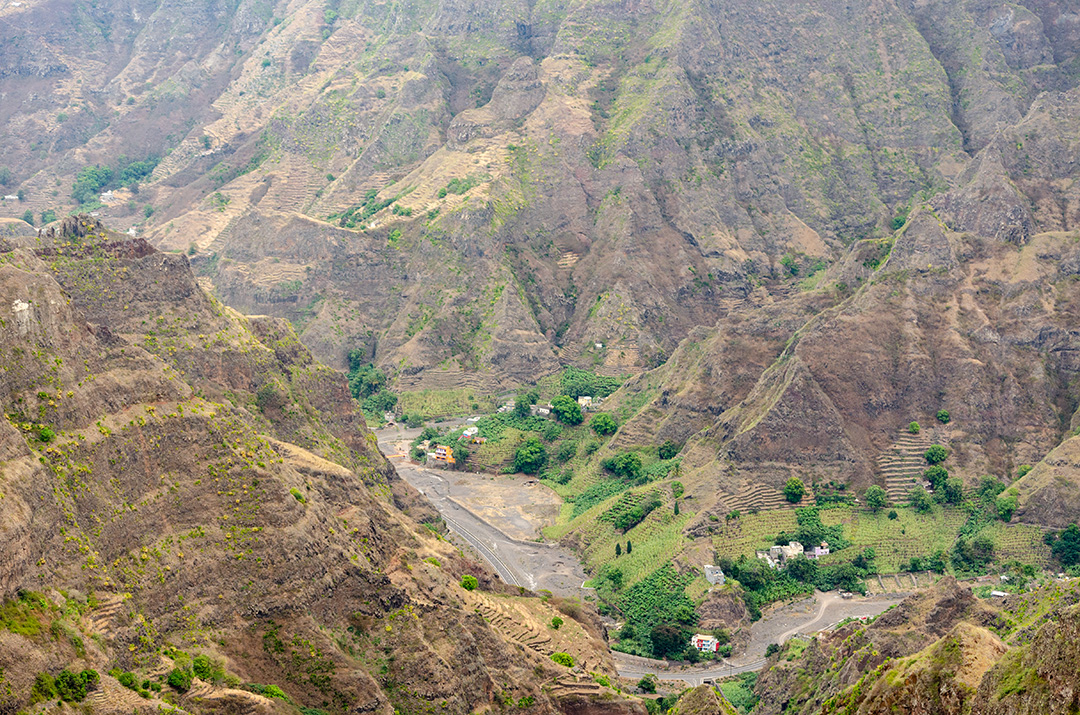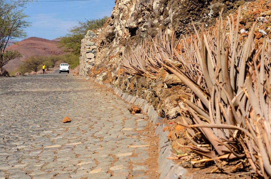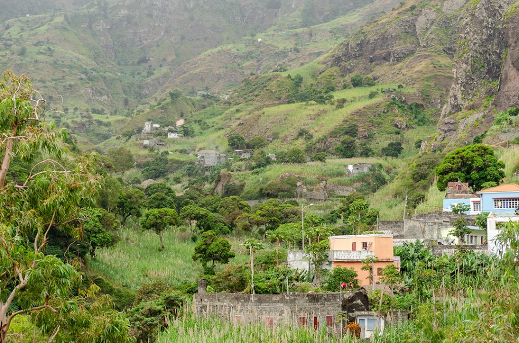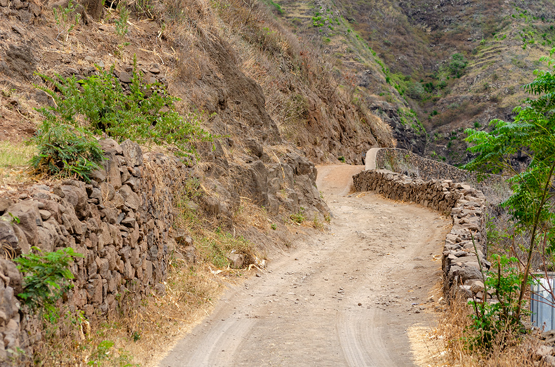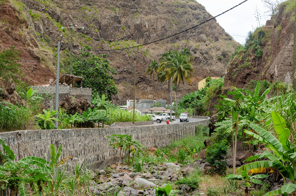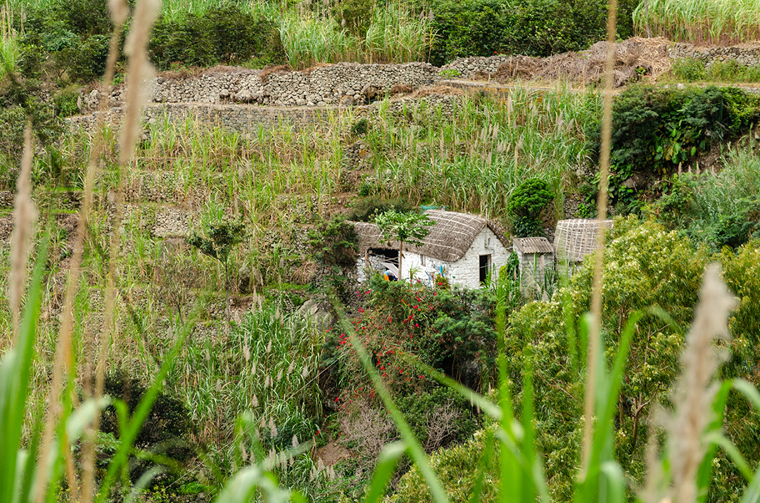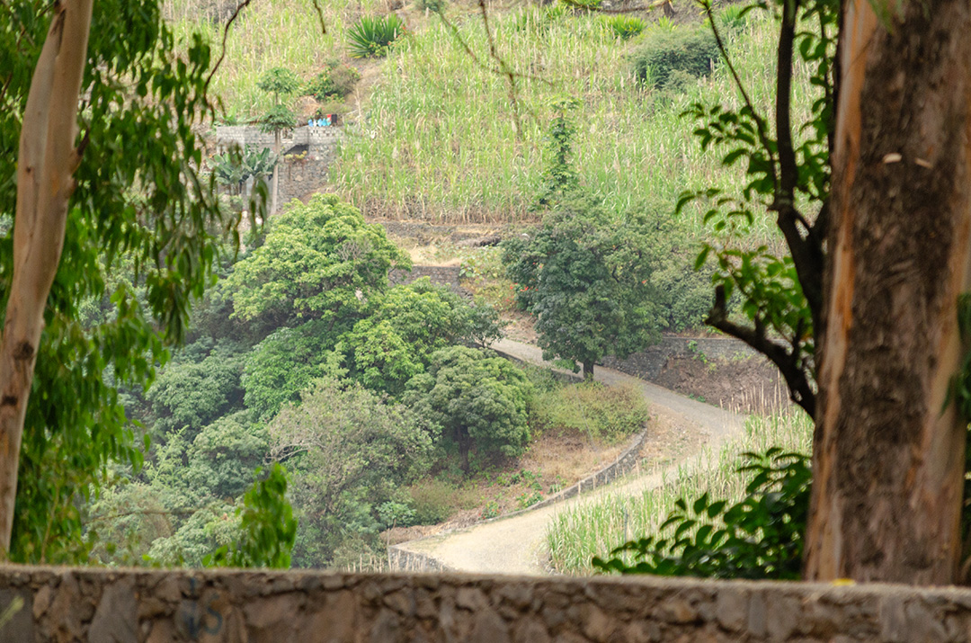 В Сидаде-дас-Помбас мы сворачиваем с шоссе и едем вглубь долины Рибейра-ду-Поль. В зарослях то и дело мелькают белые стены — это традиционные кабовердианские дома. Они маленькие, одноэтажные и окружены множеством хозяйственных построек. Дорога ведет мимо плантаций сахарного тростника, кофе и маниока.