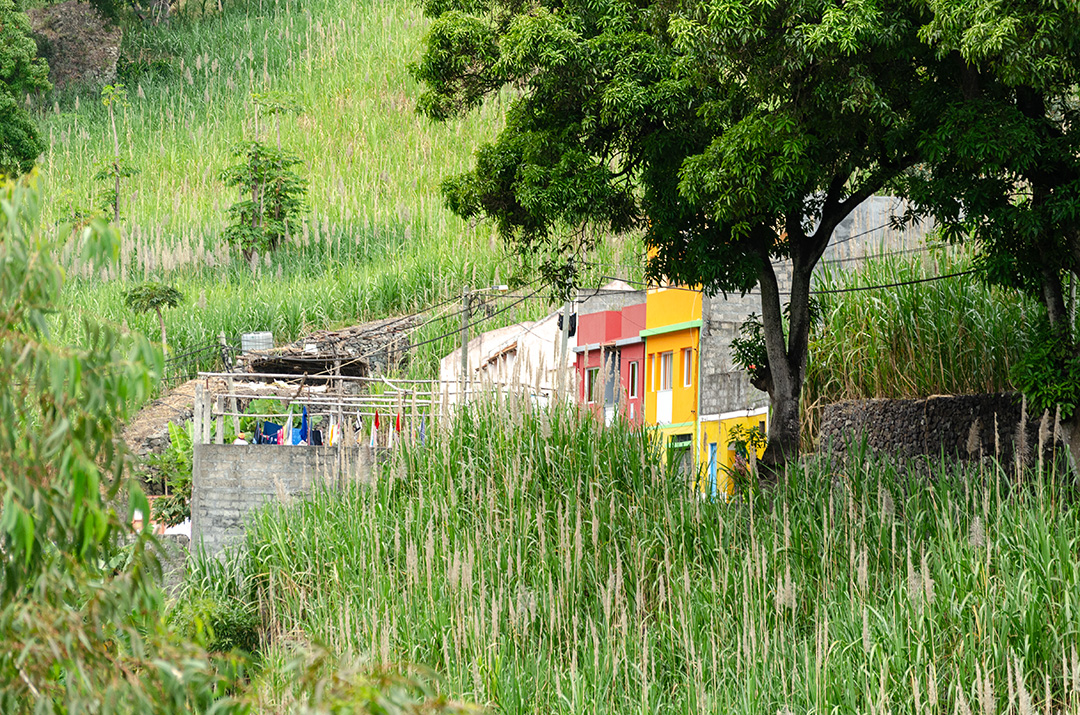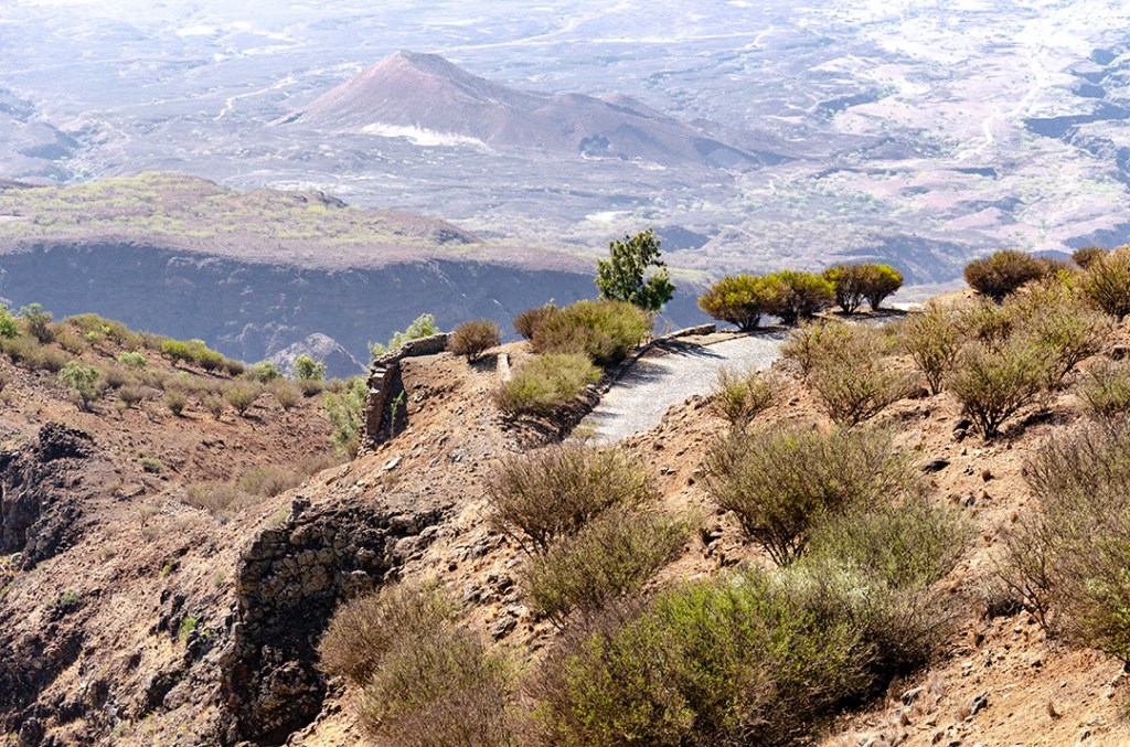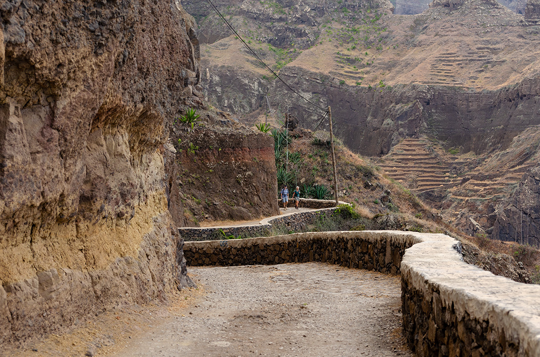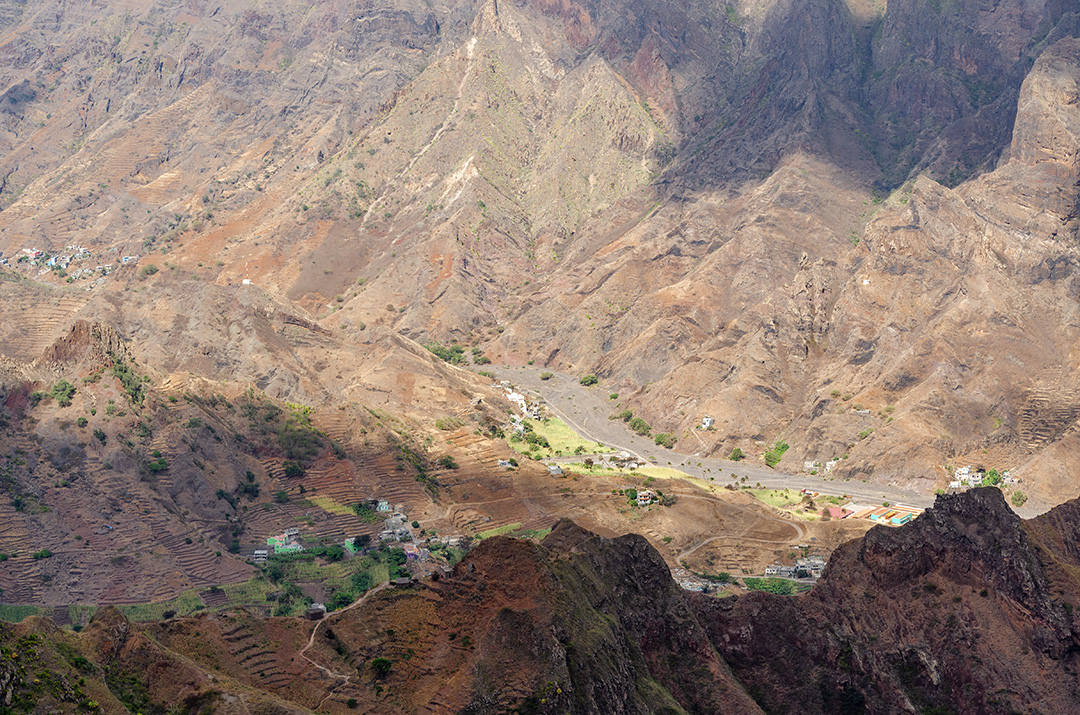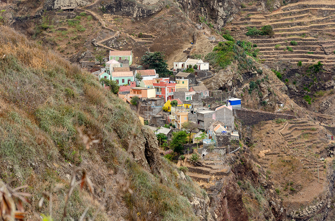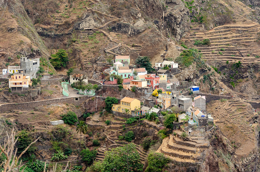 В Сидаде-дас-Помбас мы сворачиваем с шоссе и едем вглубь долины Рибейра-ду-Поль. В зарослях то и дело мелькают белые стены — это традиционные кабовердианские дома. Они маленькие, одноэтажные и окружены множеством хозяйственных построек. Дорога ведет мимо плантаций сахарного тростника, кофе и маниока.