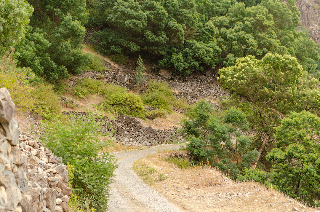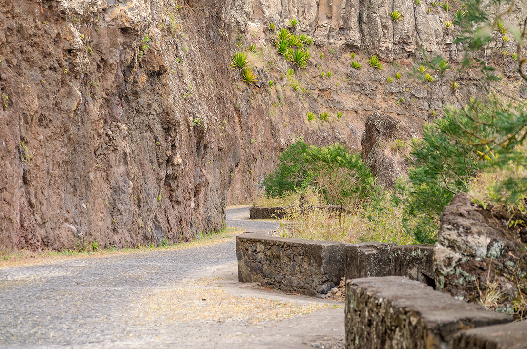 Старое шоссе пересекает природный парк Кова-Поль-Рибейра-да-Торра, который еще не включили в Список всемирного наследия ЮНЕСКО, но обязательно включат. Эта территория объединяет кальдеру и две узкие и длинные долины, образованные реками Рибейра-да-Поль и Рибейра-да-Торра. Последние начинаются в горах, прорезают их и впадают в Атлантический океан. Дорога вьется практически параллельно Рибейра-да-Торра, но значительно выше, и время от времени с нее открываются душераздирающие виды (я все-таки побаиваюсь высоты, хотя и борюсь с этим) на долину и домики, зажатые между горными тисками.