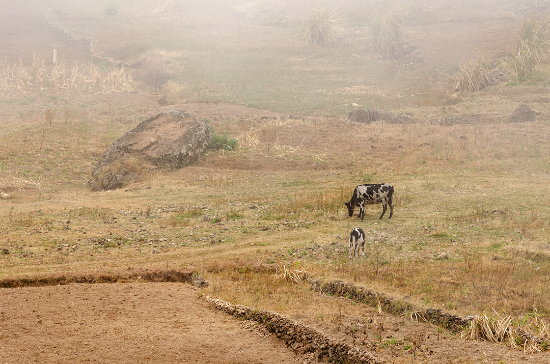 Облака рассеиваются так же внезапно, как и появляются. Солнце снова пробивается сквозь ветки. Гид говорит, что так здесь бывает по несколько раз на день, а бывает, что и целыми днями кальдера затянута плотной дымкой. Так что нам повезло посмотреть сверху на террасы, усаженные кукурузными початками, и томных коров, которые не торопясь щиплют траву.