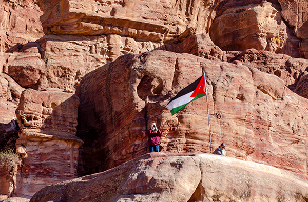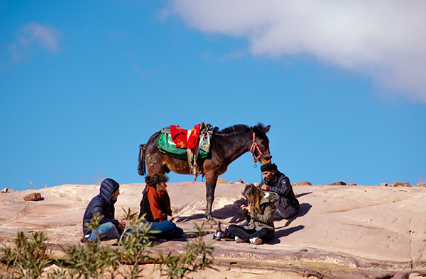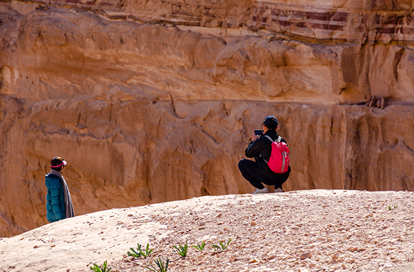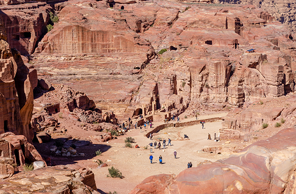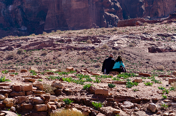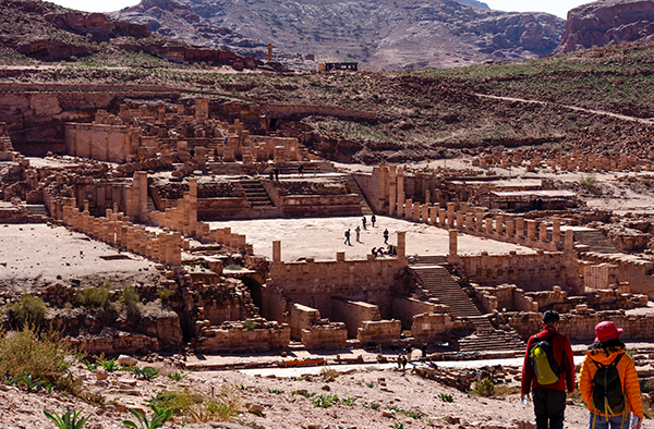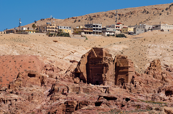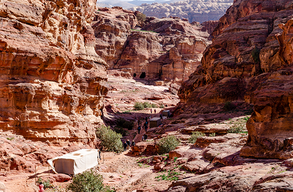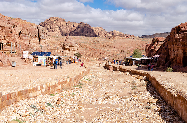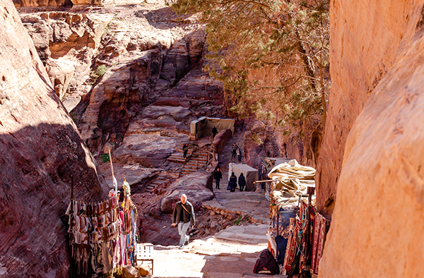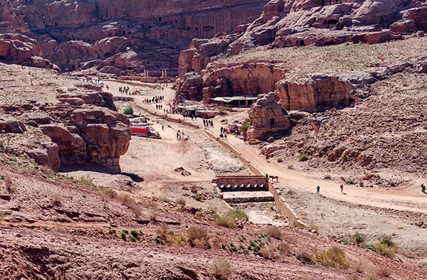 Лучше всего осматривать Петру с высоты — подняться хотя бы к улице фасадов, череде гробниц, строго смотрящей на каньон пересохшей речки Вади Муса. Здесь тоже процветает бедуинская торговля, и продают то же, что и внизу: турки разных размеров, куфии, прозванные у нас благодаря другу советского народа Ясиру арафатками, и, конечно, цветной песок. Последний окрашен естественным путём, и выполняющие роль наглядной агитации картонки утверждают, что только здесь он таков. В остальной Иордании, дескать, втюхают вам втридорога крашеную грязь.