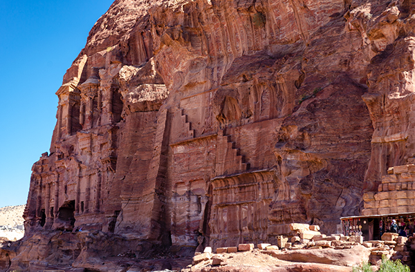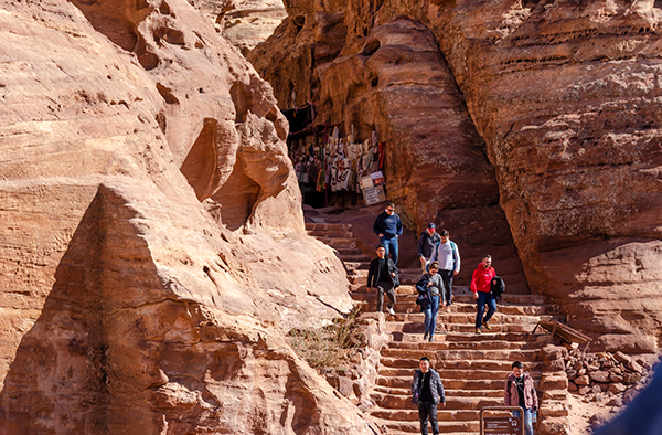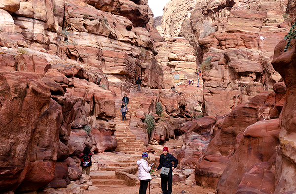 После равнинной части начинается небольшой ад, во время которого я даже малодушно думаю об осликах. Последний километр пути — это почти одна сплошная лестница вверх. Местами ступеньки стёрты от времени, местами очень крутые, местами тебя пытаются столкнуть в пропасть лихие ослы. Нужно карабкаться выше и выше, и конца края этому не видно. Тут легко отчаяться, но в конце концов ты выходишь на площадь перед вырубленным в скале монастырём Ад-Деир (что переводится с арабского как «монастырь»).