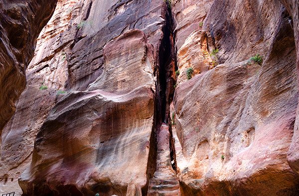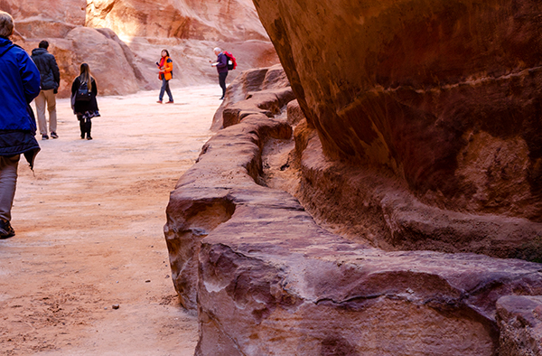 Первая часть пути обманчиво легка. Небольшой спуск преодолевается быстро и ненавязчиво. В каньоне довольно холодно и капает вода. Тысячи лет назад она собиралась и по терракотовым трубам стекала в огромные подземные резервуары, что обеспечивало Петру водоснабжением.