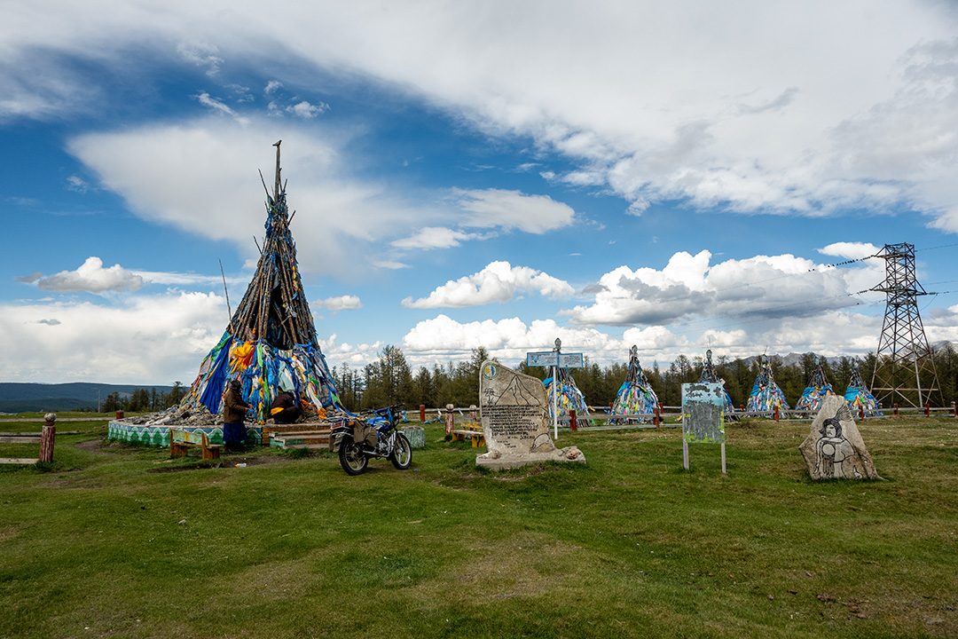 На самом высоком перевале мы останавливаемся возле обо, чтобы принести жертву духам — хозяевам местности, иначе не избежать неприятностей в пути. Вместе с нами здесь двое на мотоцикле. Они оставляют на обо несколько печенек и поливают его араком — крепким спиртным напитком из коровьего или кобыльего молока.